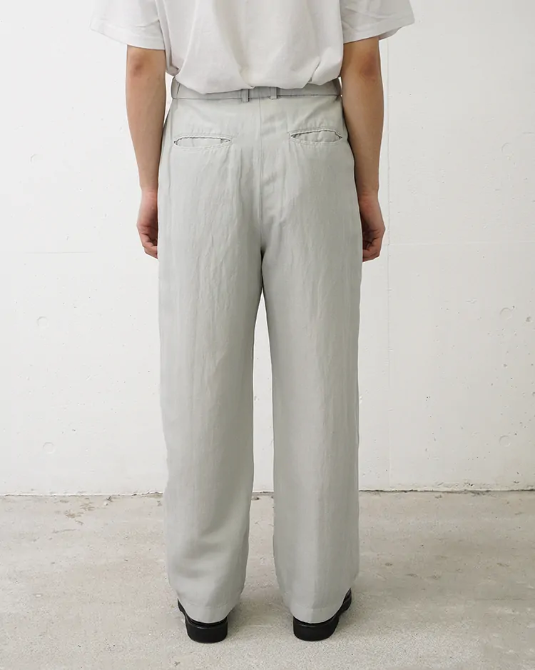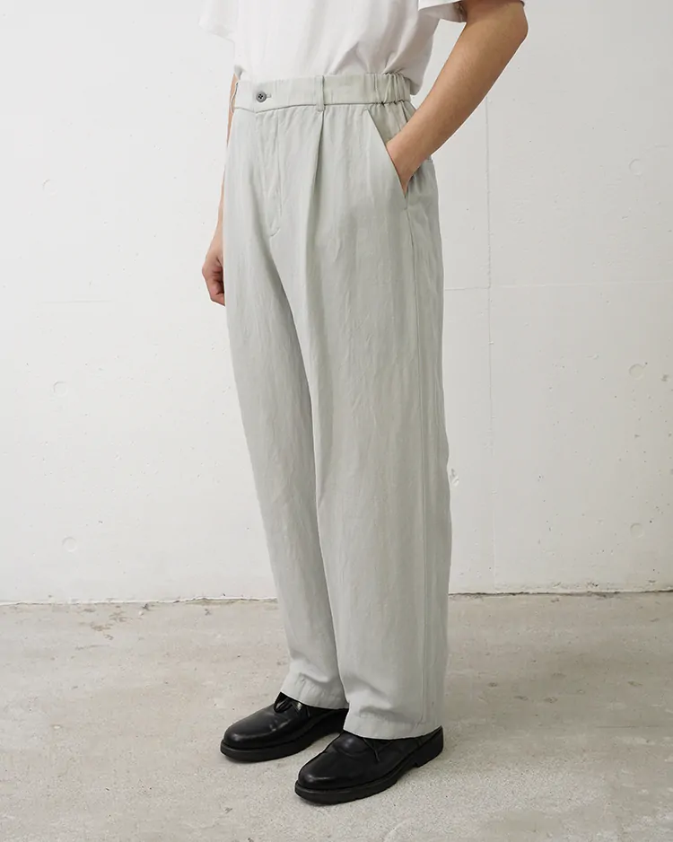 裾に向かい程良いテーパードシルエットに仕上げた、リラックス感ある雰囲気が特徴の2タックパンツ。両脇にギャザーが寄っており、紐もベルト内側に通っているので、表に紐を出さず調節し、着用可能です。製品染めを採用しているので、製品で洗っても縮みが少なく、速乾性があるのも特徴です。