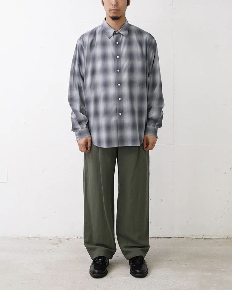 裾に向かい程良いテーパードシルエットに仕上げた、リラックス感ある雰囲気が特徴の2タックパンツ。両脇にギャザーが寄っており、紐もベルト内側に通っているので、表に紐を出さず調節し、着用可能です。製品染めを採用しているので、製品で洗っても縮みが少なく、速乾性があるのも特徴です。