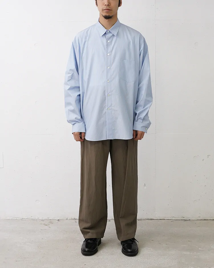 タテにコットンの強燃糸、ヨコに細番手のリネン糸を使い、静岡県浜松市でやや甘めに織り上げたビエラ素材です。コットンの強燃糸のサラッとしたタッチと、リネンのゴワっとしたハリ感が特徴です。製品で染める事で、縮みも起きず、速乾性も兼ね備えた素材です。