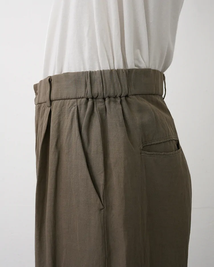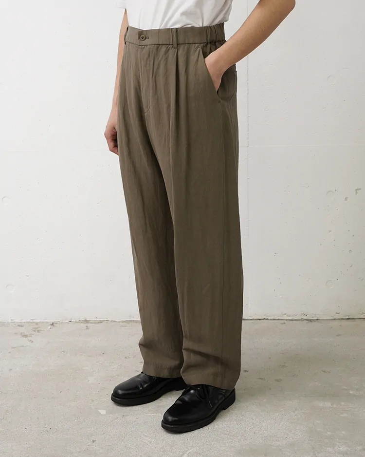裾に向かい程良いテーパードシルエットに仕上げた、リラックス感ある雰囲気が特徴の2タックパンツ。両脇にギャザーが寄っており、紐もベルト内側に通っているので、表に紐を出さず調節し、着用可能です。製品染めを採用しているので、製品で洗っても縮みが少なく、速乾性があるのも特徴です。