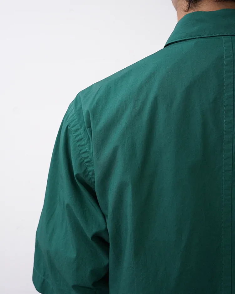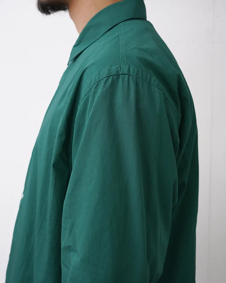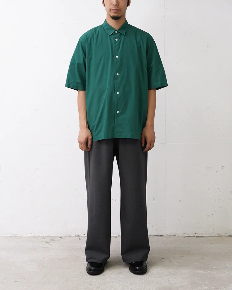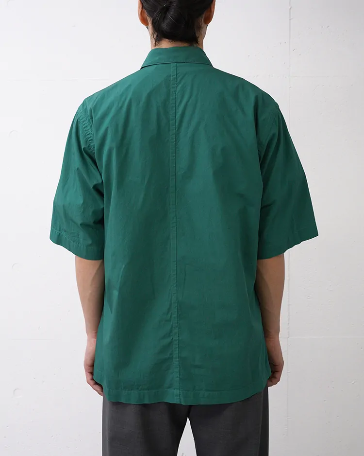 オーバーサイズで、リラックスしたシルエットが特徴の半袖シャツ。背中心は縦接ぎを採用し、ブルゾンのような迫力ある表情に仕上げています。製品染めを施しているので、洗濯しても縮みは起きず、取り扱いも楽です。