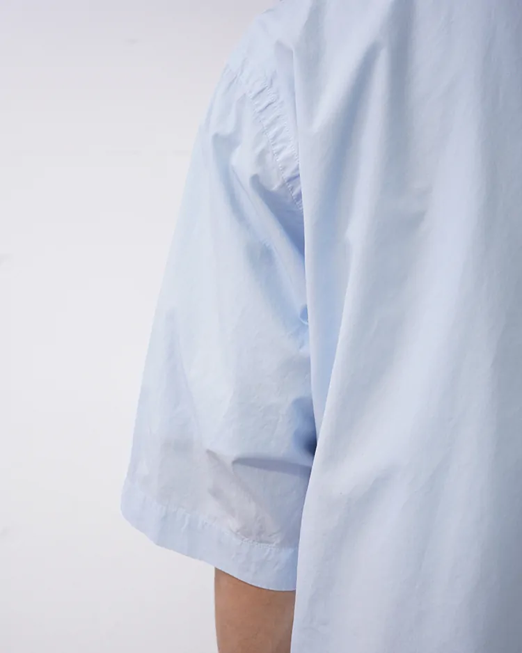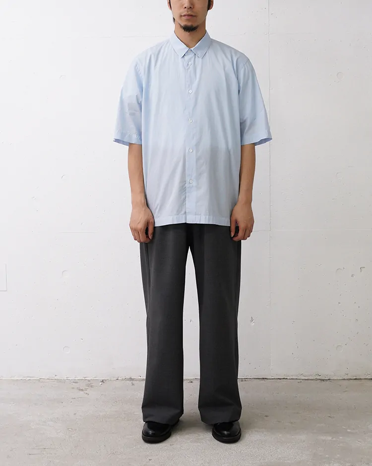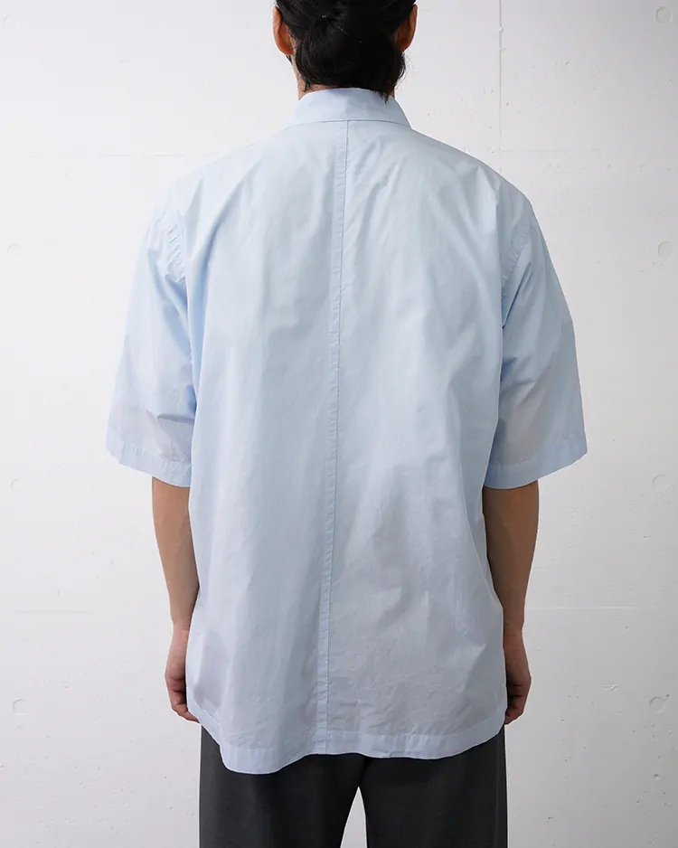 オーバーサイズで、リラックスしたシルエットが特徴の半袖シャツ。背中心は縦接ぎを採用し、ブルゾンのような迫力ある表情に仕上げています。製品染めを施しているので、洗濯しても縮みは起きず、取り扱いも楽です。