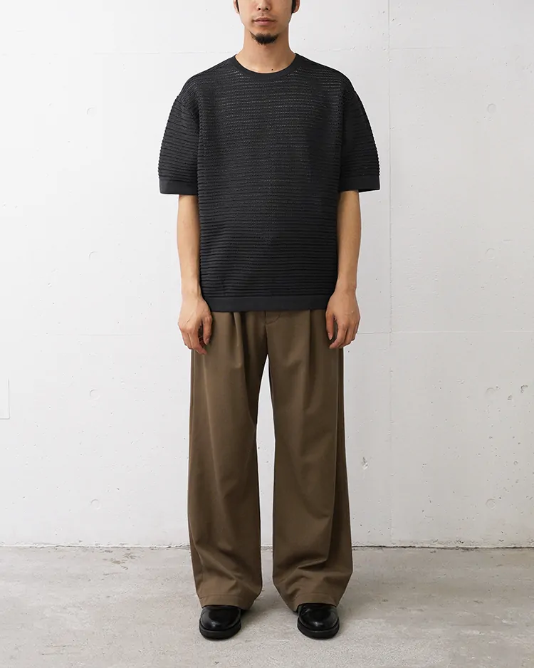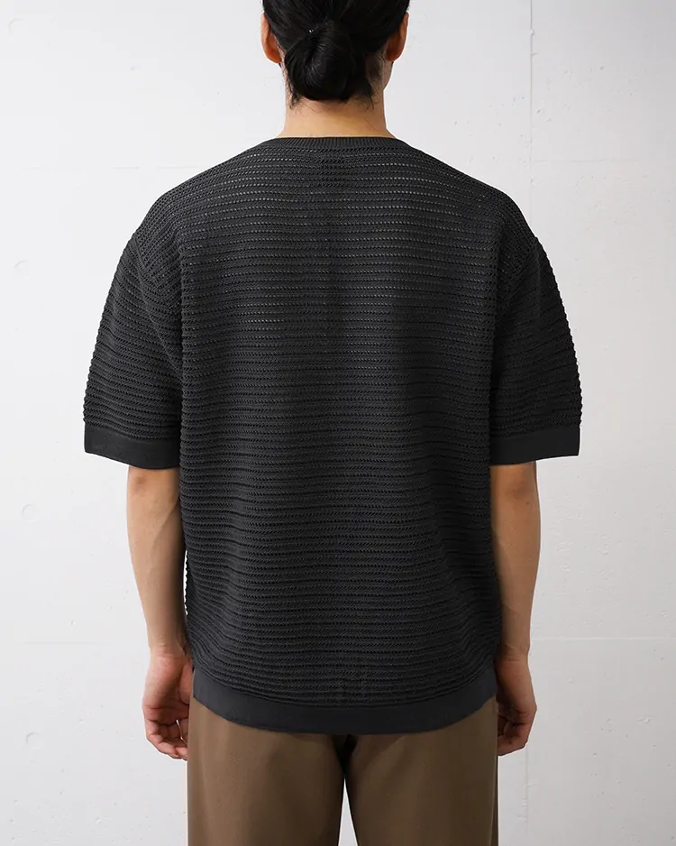 細番手のコットン糸に天然由来の特殊樹脂をコーティングした糸を多本取りし、立体的な透かし柄で丁寧に編み上げたサマーニット。透け感を抑えながらも通気性の高い、ドライな風合いに仕上げました。裾にはスリット入り。