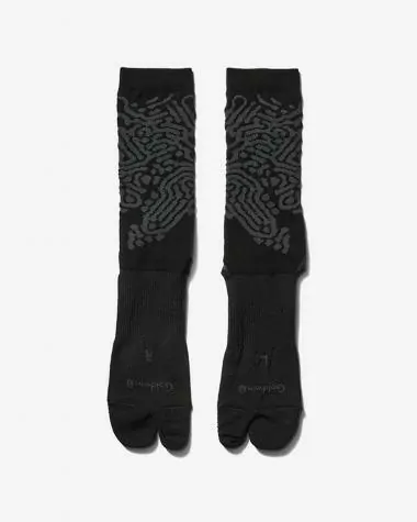 日本では古くから調湿機能があることで重宝されてきた天然由来の素材、紙の糸を使用した足袋ソックス。心地よいドライ感が魅力のソックスに、C3fit独自のサポート構造を取り入れています。また、足首から上には、ヒョウやトカゲ、熱帯魚など自然界の柄に現れる数理モデルを組み込んだ AIを利用してデザインしたアートワークが編み込まれています。