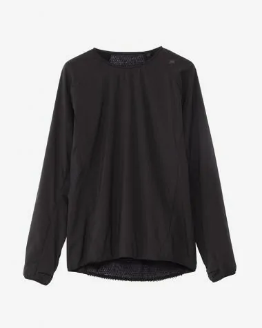 サイドパネルやラグランスリーブなど、腕振りしやすいパターン設計を採用。ポケットなどのパーツを省いた、ミニマルなデザインです。袖口は、サムホール仕様。着脱しやすいよう、ネックラインや袖口、裾はストレッチバインダーで仕上げました。