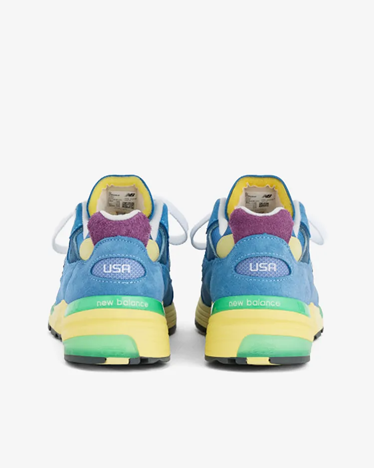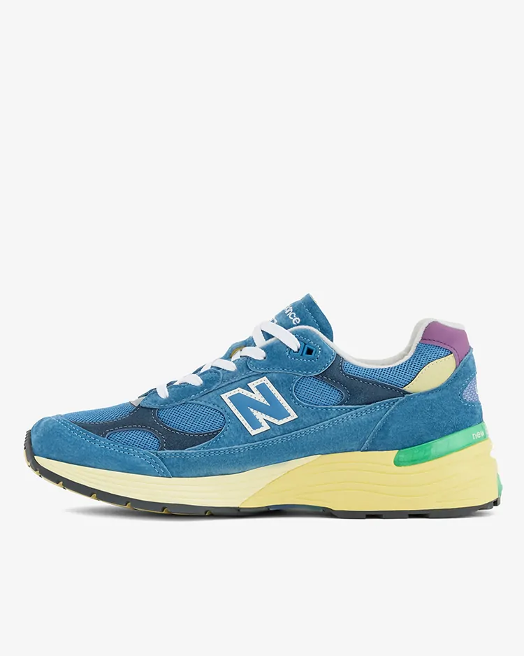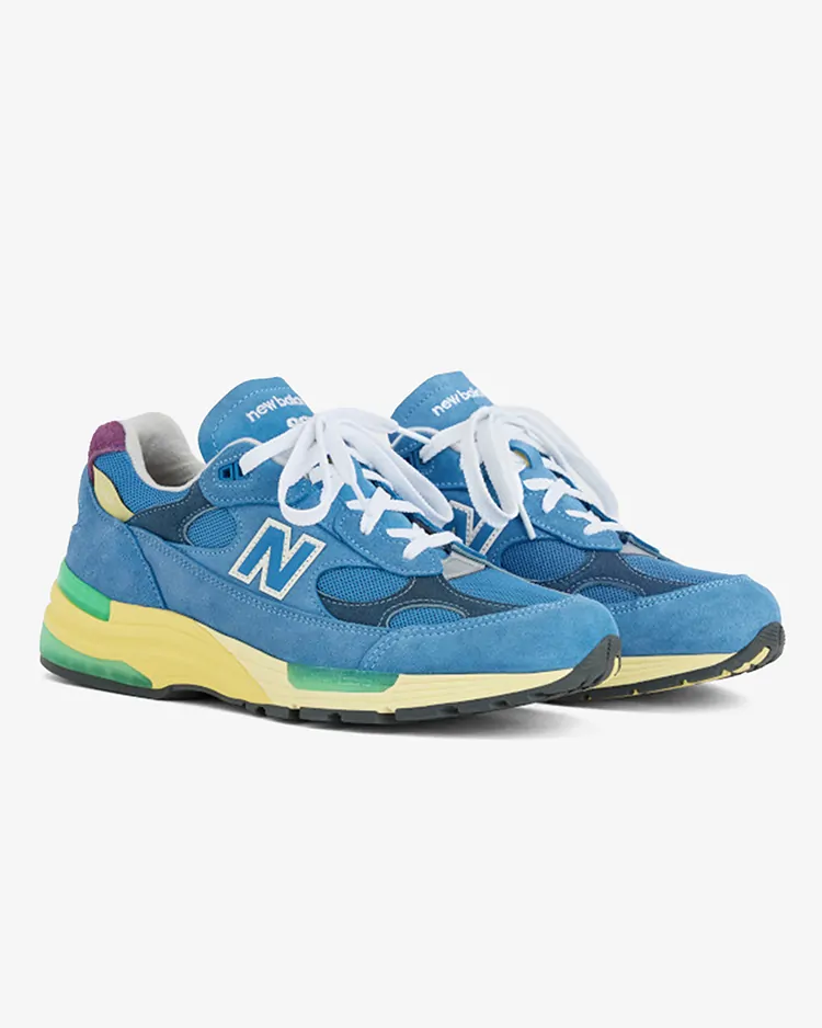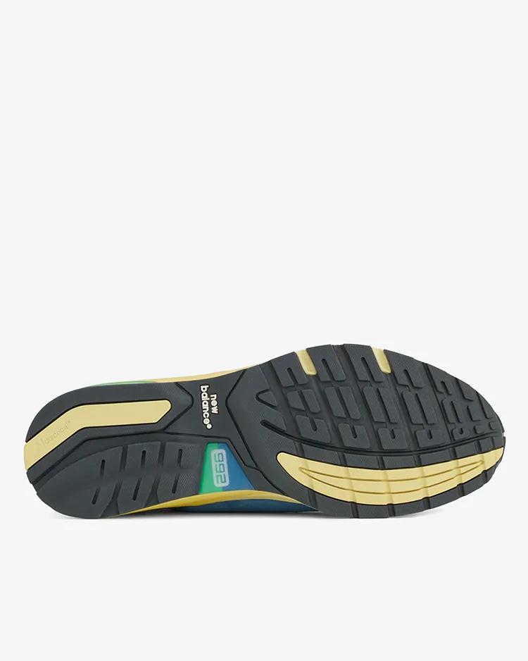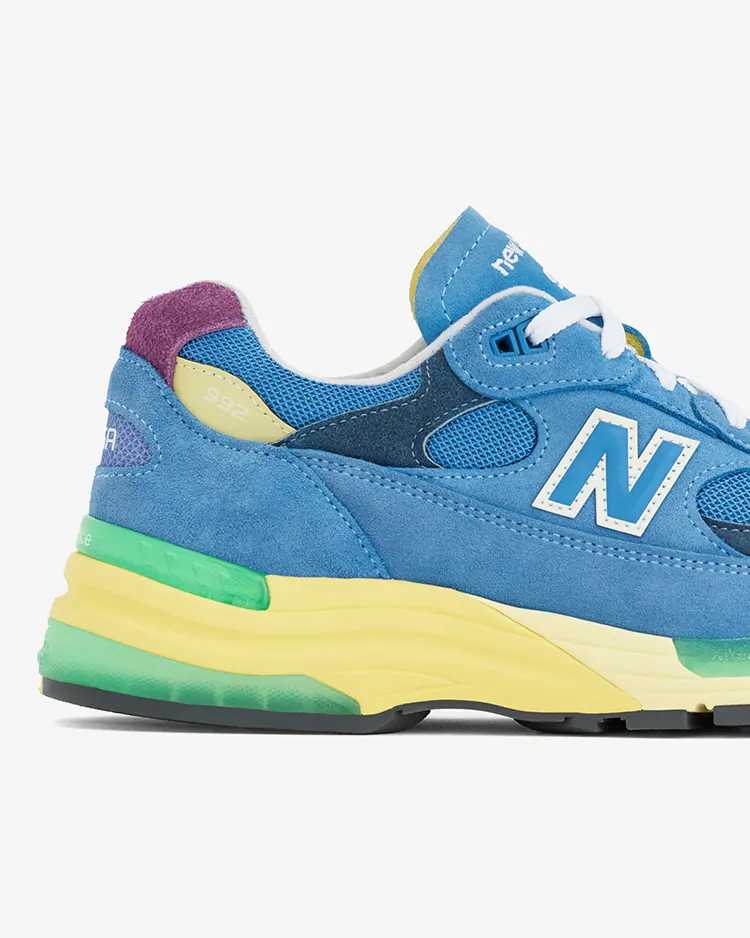 ベースとなるのは、2006年にブランド創立100周年を記念して誕生し、当時のテクノロジーを結集させた"992"。前足部に衝撃吸収性の高い"ABZORB(アブゾーブ)"、後足部には弾力性と耐久性を強化した"ABZORB SBS"を搭載。さらに、スムーズな足運びを導く"TS2"や、耐摩耗性に優れた"N DURANCE(N デュランス)"を余すことなく注ぎ込んでいる。アッパーは、くすんだ色合いが美しいシーストーンのメッシュと、上質なピッグスキンスウェードをメインに構築されている。